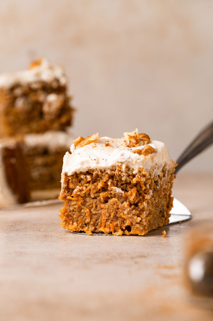 Αυτό το carrot cake δεν έχει κλασικό αλεύρι, αλλά αλεύρι βρώμης, πράγμα που το κάνει πλούσιο σε φυτικές ίνες και μια καλή επιλογή ακόμα και για τους ανθρώπους με δυσανεξία στη γλουτένη. Δεν περιέχει επεξεργασμένη ζάχαρη, μόνο χουρμάδες στη βάση του και λίγο μέλι στο frosting. Είναι απίστευτα ζουμερό μιας κι έχει μέσα καρότα, ελαιόλαδο και όλα τα υλικά που προανέφερα, οπότε δεν βγαίνει στεγνό σαν τα τυπικά κεικ και ίσως σε κάποια σημεία θα είναι πιο υγρό, ίσως και “λασπωμένο”. Μην το φοβηθείς. Είναι μια χαρά ψημένο. Ο συνδυασμός του πλούσιου σε φυτικές ίνες κέικ με το πλούσιο σε πρωτεϊνη frosting, το κάνει, πέρα από θρεπτικό, πολύ χορταστικό, μιας και οι φυτικές ίνες όταν συνδυάζονται με πρωτεΐνη συνεργάζονται τέλεια για τον κορεσμό μας.
